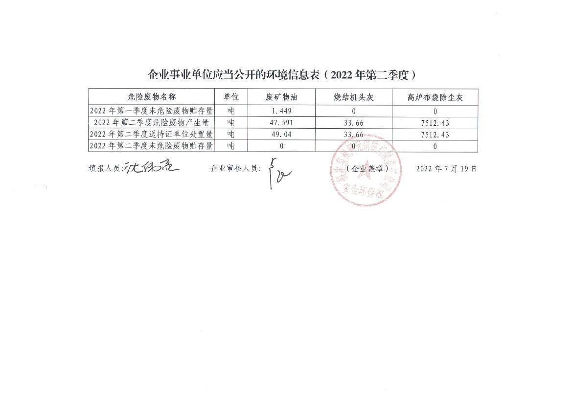 企業(yè)事業(yè)單位應(yīng)當(dāng)公開的環(huán)境信息表(2022年度第二季度)