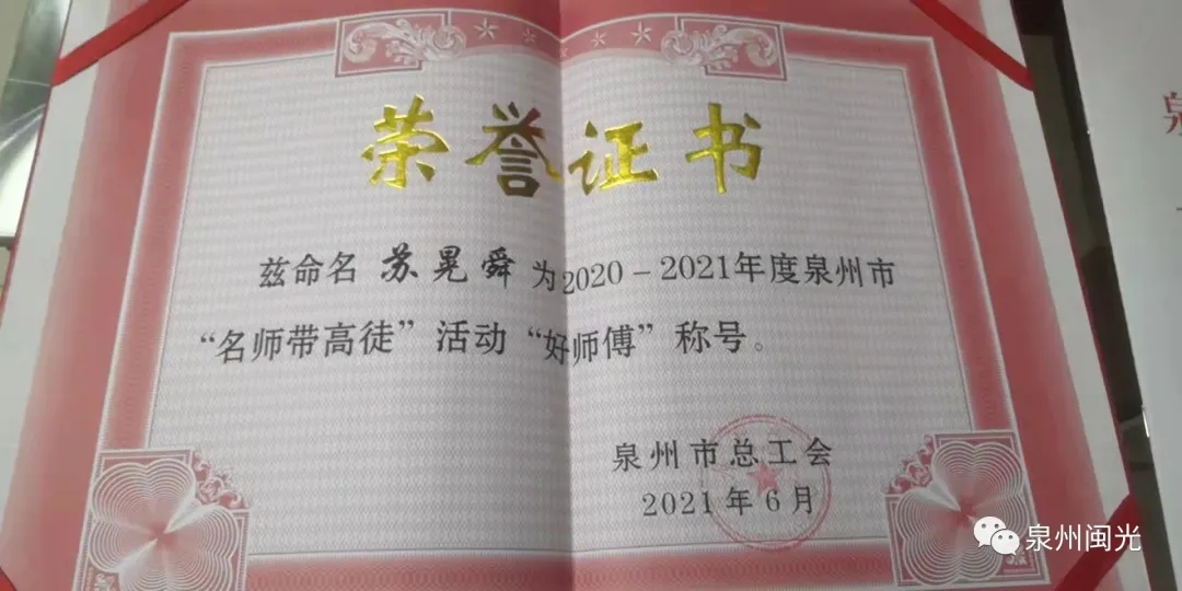 日前,動力廠蘇晃舜同志被泉州市總工會授予2020-2021年度泉州市“名師帶高徒”活動“好師傅”稱號。